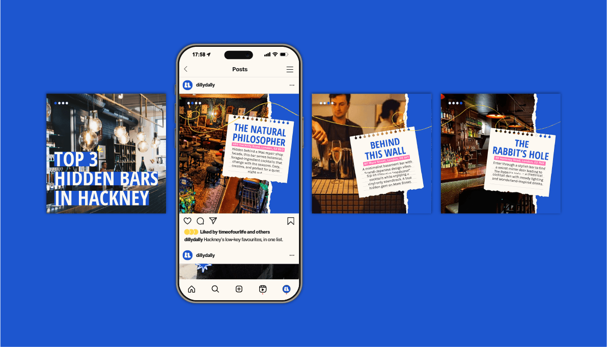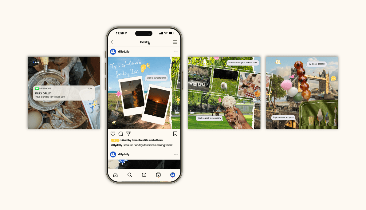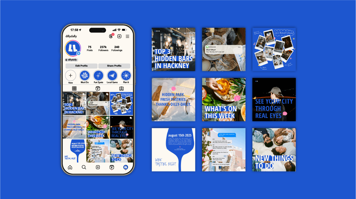 Dilly Dally is a video-first marketplace, often described as TikTok meets Airbnb. The challenge was to create a brand that felt as energetic and exploratory as social media, while maintaining the trust and clarity expected of a booking platform. The identity needed to celebrate aimless wandering while guiding users towards intentional booking.