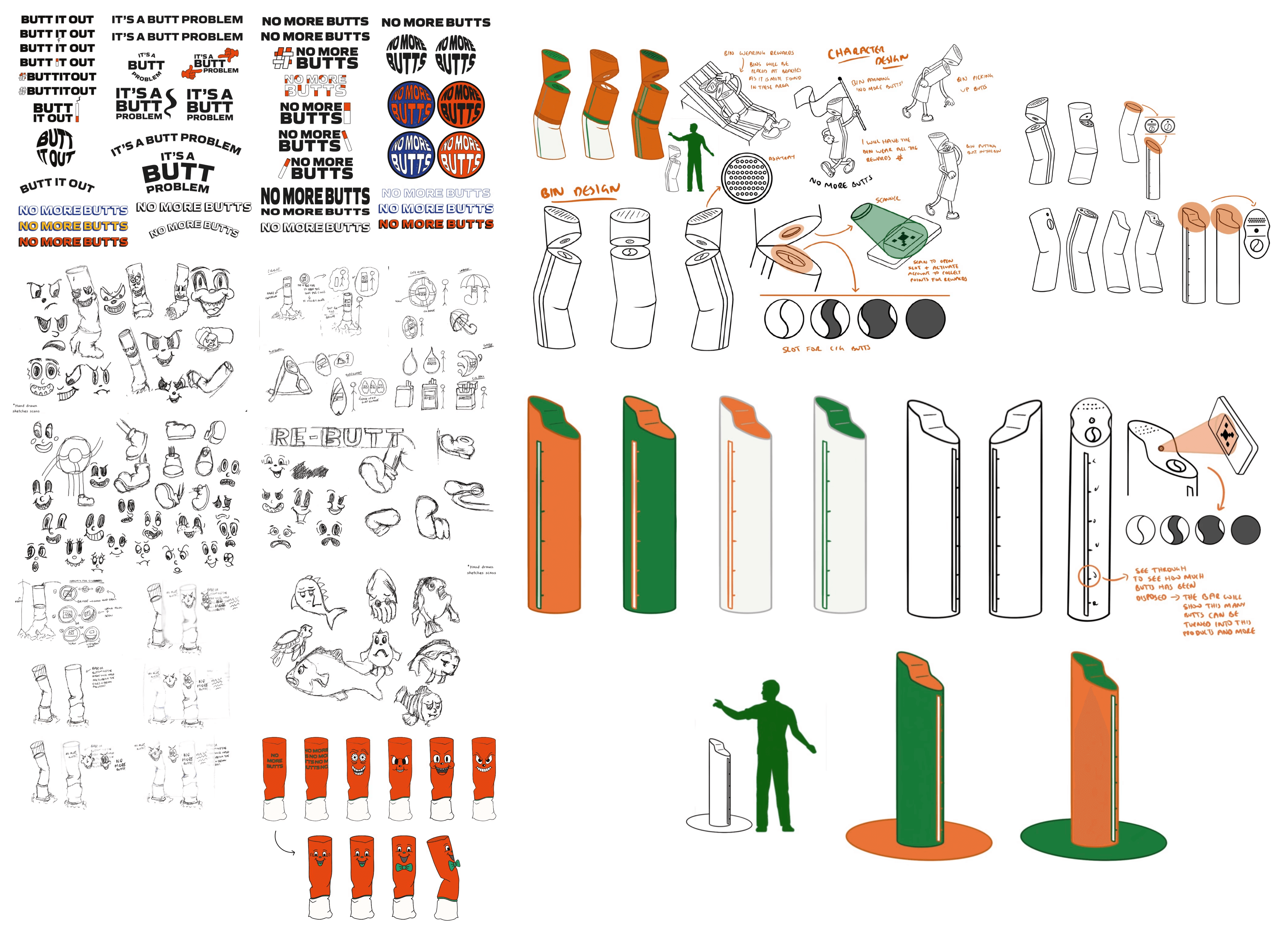 The “No More Butts” campaign combines character design with practical bin design to address cigarette littering in a more engaging way. Playful cigarette characters help humanise the issue and create a stronger emotional connection than a traditional warning. This idea carries through to the bin design, which takes the shape of a cigarette butt to make its purpose clear and intuitive. QR codes and transparent fill bars add a gamified element, turning proper disposal into a visible, community-driven effort.
